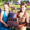 Photo 2: 2014 recipient Augie Staudacher of Yorkville passes the Sue Kuefler Award to 2015 recipient Anna Merrigan of Minooka on Saturday at Harris Forest Preserve. Merrigan also won the costume class, with her Native American tribute.