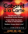 The cabaret acts are as follows: “He Said, She Said: A Broadway Gender-Bender” featuring Harmony Barry Hickey, Susan Able Barry, Zach Gibson, & Eric Rasmussen; “Listen With Your Heart: The Music of Alan Menken” featuring Christine & David Pfenninger; and “Stalkers: Songs About Love”, featuring Kelley Buesse & Jim Molina.