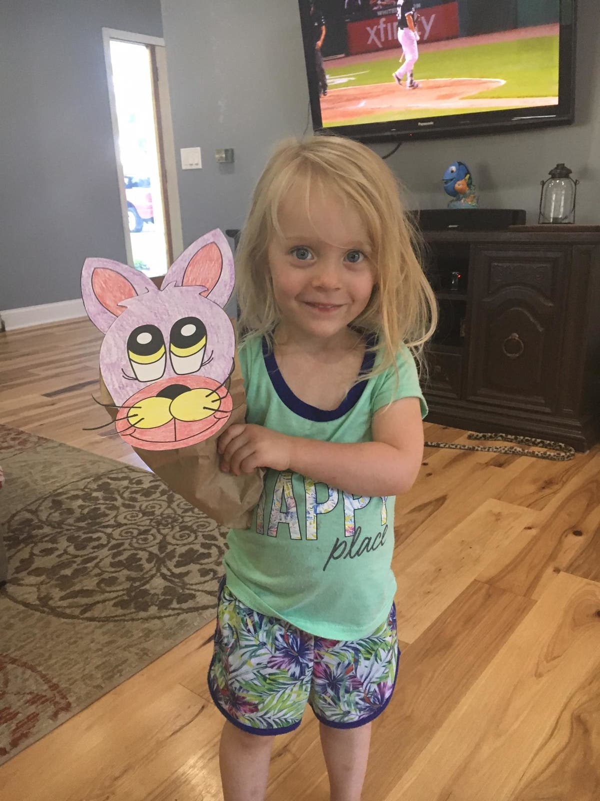 This little girl made Responsible Rabbit with our Paper Bag Activity Book, looks like she had some help with staying in the lines and cutting! From this, discuss what it means to be responsible, like asking your child, "Who is responsible to clean your mess? "Who is responsible to brush your teeth?" I used to ask my students when they forgot their homework, "Who is responsible to get your homework into your backpack?" This character does a lot with such fun stories, crafts and talks.
