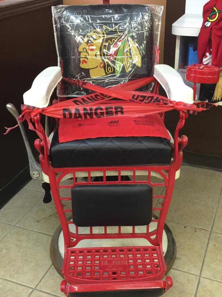 Lee's Barber Shop has a Blackhawks chair but you can't sit in it ... for now.