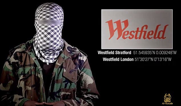 The Mall of America in Minnesota is specifically named in the video, as are two London malls, but the masked terrorist encourages attacks on all Westfield malls. “Can you imagine what a dedicated mujahedeen in the West could do to the American and Jewish-owned shopping centres across the world?” he says.