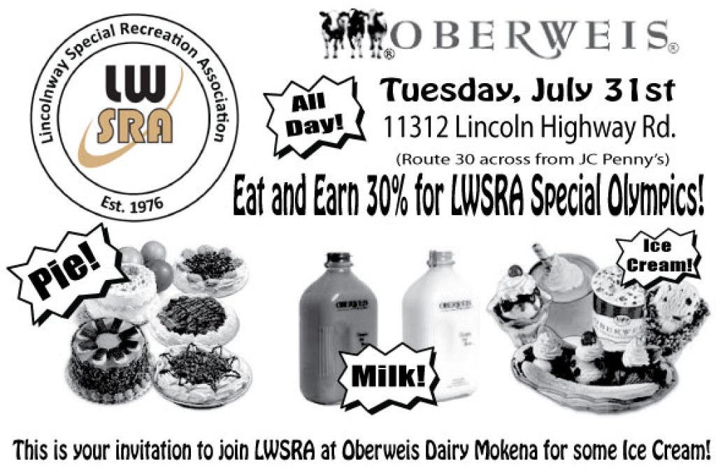 Bring in flyer to Oberweis Mokena to donated 30% to LWSRA's Special Olympics Programs on Tuesday, July 31st.