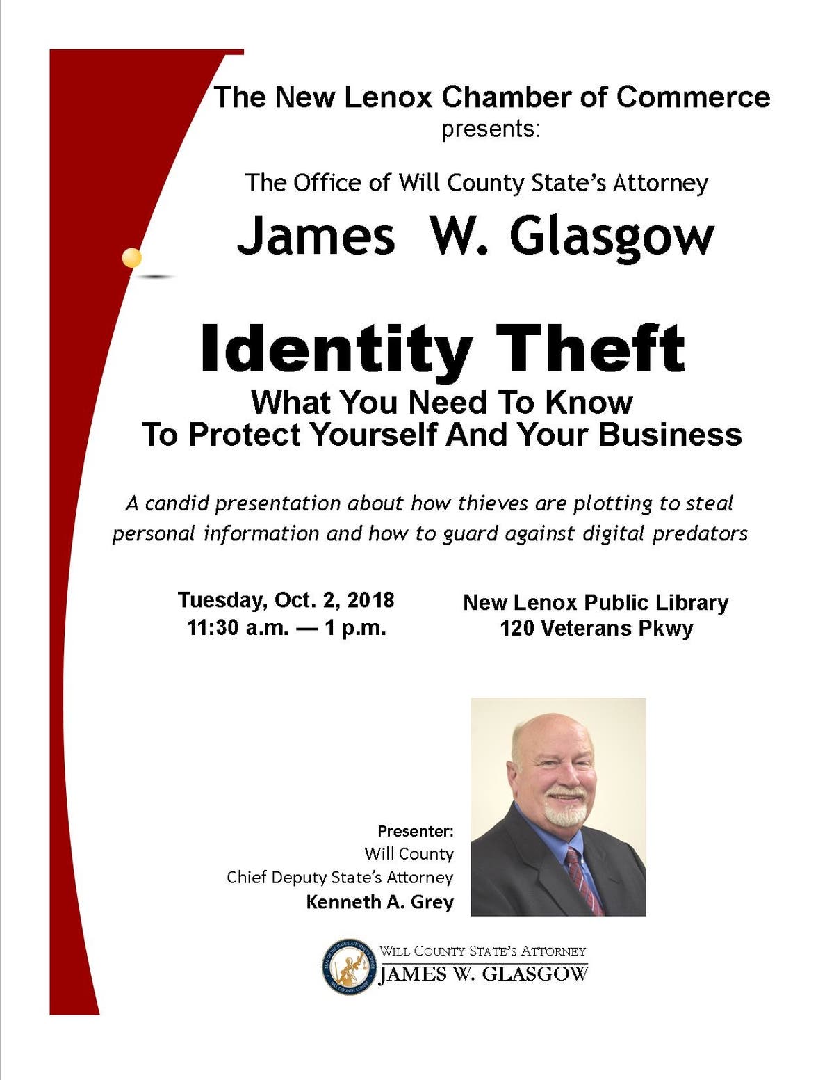 NEW LENOX, IL - The New Lenox Chamber of Commerce is partnering with Will County State’s Attorney James W. Glasgow for a Business on the Move Luncheon that aims to help businesses and residents from becoming victims of identity thieves. Chamber members, area business owners, and residents are invited to attend the luncheon on Tuesday, Oct. 2. The event will last from 11:30 a.m. to 1 p.m. at New Lenox's Public Library, 120 Veterans Pkwy, New Lenox.