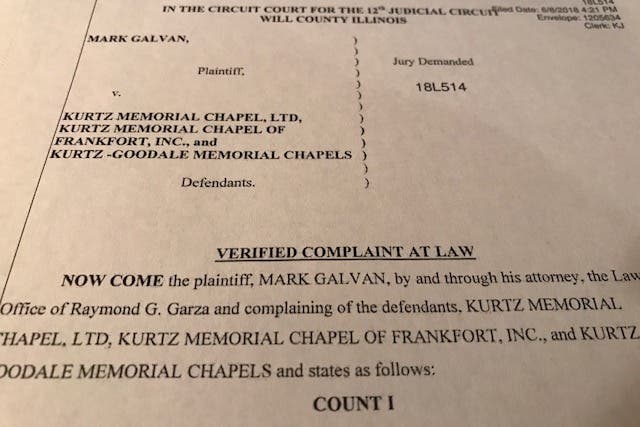 NEW LENOX, IL - A local resident who visited Kurtz Memorial Chapel in New Lenox two summers ago has retained a lawyer to file a civil lawsuit against the long-time Lincoln-Way funeral service. Mark Galvan filed his negligence lawsuit at the Will County Courthouse on Friday. Galvin is represented by New Lenox lawyer Raymond G. Garza. Their lawsuit names Kurtz Memorial Chapel, Kurtz Memorial Chapel of Frankfort and Kurtz-Goodale Memorial Chapels as defendants.