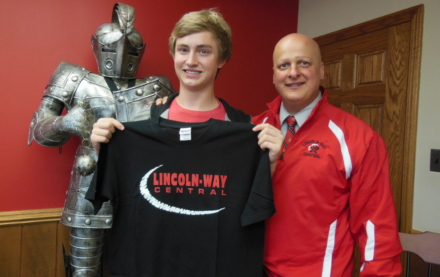 Lincoln-Way Central junior James Watson accepts a Knight t-shirt presented to him by Dr. Steve Provis, principal. James will be joining a small group of high school students and adults in Crew 3000 to help restore the reef system in the western Caribbean ocean. Students and adults use their scuba diving skills to expand a coral nursery and transplant coral into the reef system for restoration purposes.