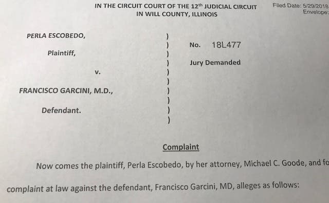 Perla Escobedo is suing Dr. Francisco Garcini who works at the Silver Cross Hospital medical complex.