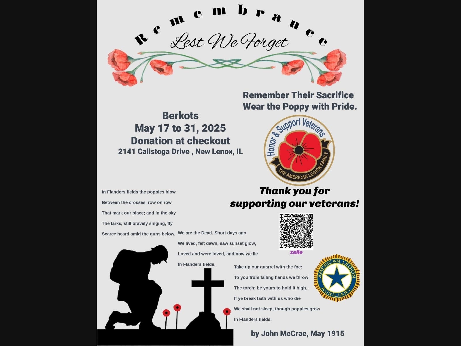 Pssst.....Can't make Berkot's? Please see photo for QR code to make a donation. Poppies also available the month of May at the American Legion Post 1977 at 14414 Ford Drive, New Lenox.