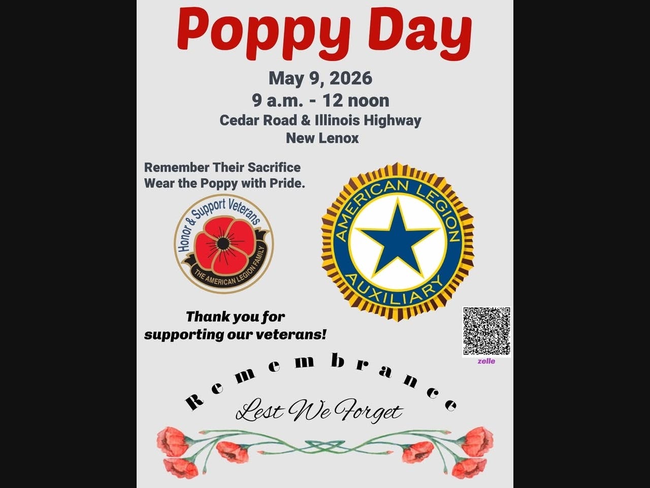 The Thomas E. Hartung American Legion Post 1977 in New Lenox will be out distributing Poppy’s in honor of National Poppy Day from 9:00am – 12:00pm on May 9th at the intersection of Illinois Highway and Cedar Road.