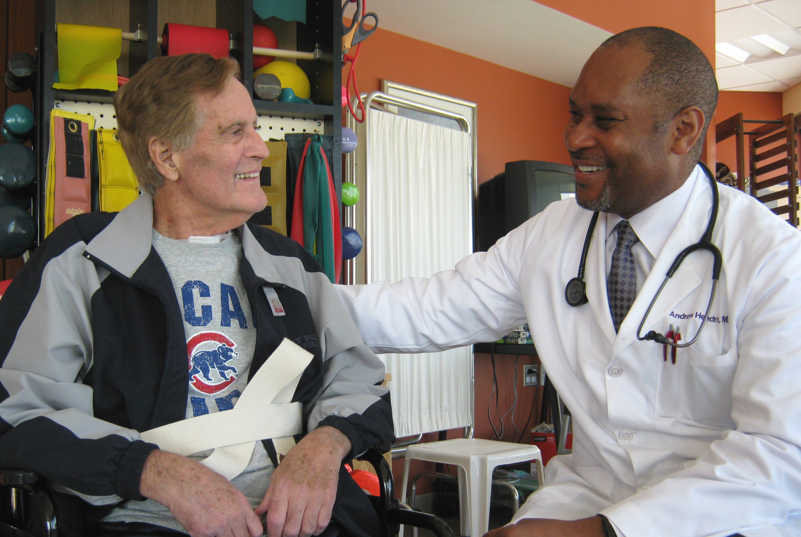 Photo caption: Dr Andrew Hendrix, Medical Director of The Rehabilitation Institute of Chicago at Silver Cross Hospital, talks with patient Lawrence Johnson of Orland Park about his treatment plan and progress after spending 6 days in the inpatient rehabilitation unit.