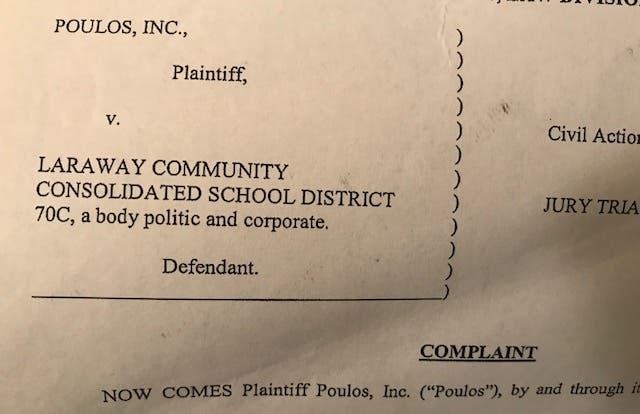 Poulos and Laraway schools signed an agreement on May 16, 2017 and the initial value of the Laraway contract was more than $5.2 million, "subject to net increases in the contract sum by change orders," court documents state.