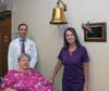 Photo captions: Longtime Silver Cross volunteer Sally Weaver (seated) rings the bell to celebrate successful cancer treatment at Silver Cross Hospital. She is pictured with her son Leroy and granddaughter Victoria; radiation oncologist Dr. Daniel Golden and nurse Kathleen Meyer, RN, BSN, celebrate the completion of Sally Weaver’s cancer treatment.
