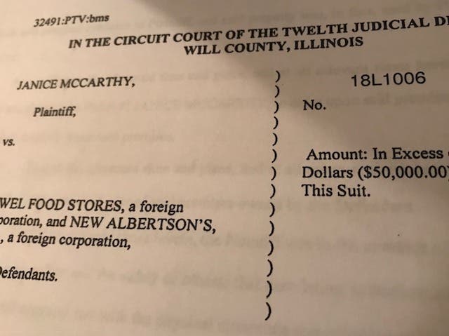 NEW LENOX, IL - The Vrdolyak Law Group in Tinley Park has filed a new civil lawsuit against Jewel Food Stores. Their plaintiff, Janice McCarthy, was injured as a result of her visit to the New Lenox grocery store on East Laraway Road, the lawsuit states.