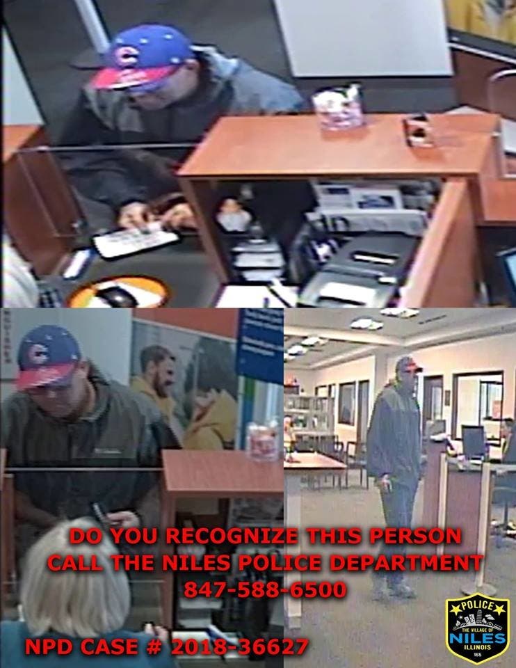 A man in a Chicago Cubs hat and sunglasses robbed the Milwaukee Avenue bank by passing a note to a teller Friday morning, Niles police said.