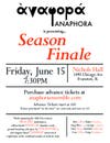 Anaphora presents "Season Finale" in only one performance at Nichols Hall (1490 Chicago Ave, Evanston) on Friday, 6/15 at 7:30 p.m.