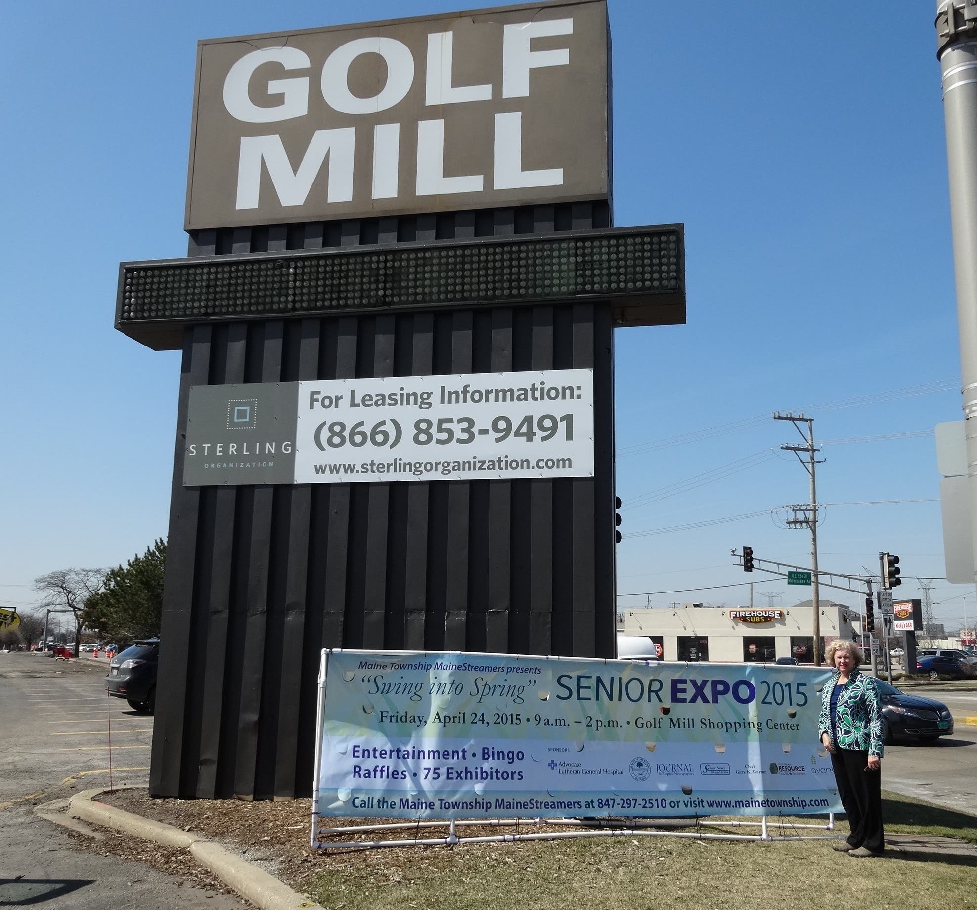 Here, Maine Township Supervisor Carol Teschky checks out the new outdoor banner just put up on the grounds of the Golf Mill Shopping Center. The banner lets the public know about the April 24 Senior Expo hosted by Maine Township and its MaineStreamers senior organization.