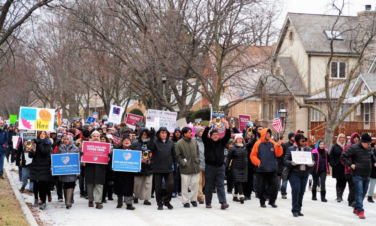 MORTON GROVE, IL - Before joining hundreds of demonstrators who flooded into O'Hare International Airport for a second night of protests against a broad migrant ban imposed by President Trump, an overflow crowd gathered at Morton Grove's Muslim Community Center (MCC) and marched through town. Police said it was the largest political demonstration in the village's recent memory, as more than 500 people sang, carried signs and spoke out against Islamophobia and Trump's executive action on immigration.