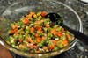 I was inspired by a very helpful customer whose eyes lit up when she told me she likes "Nopales Ensalada." Unfortunately, a language barrier prevented us from exchanging recipes, but something told me that she probably makes it often for her family. Here is a take on my own black bean salad, adding roasted tomatillos and red pepper.