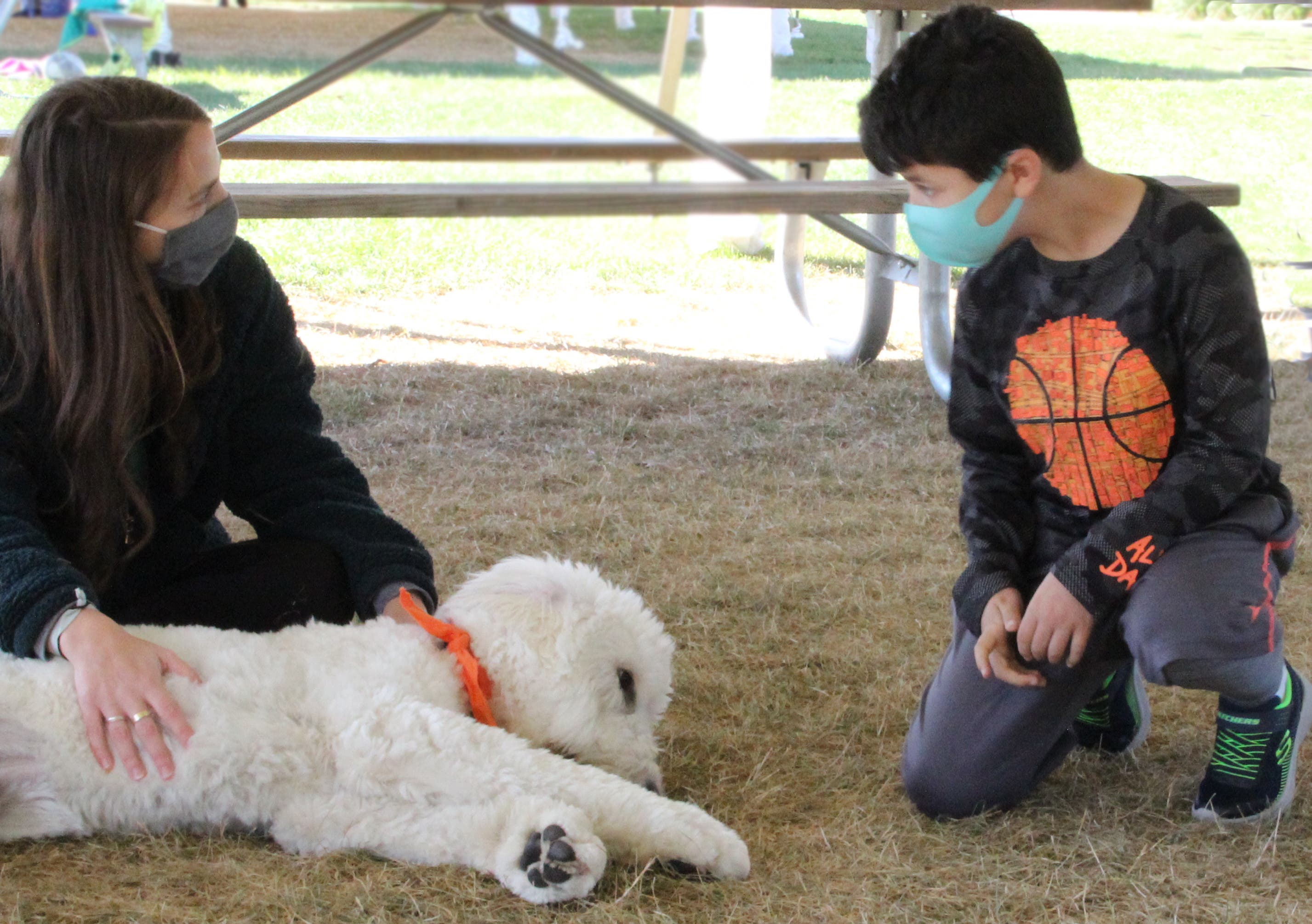 The service dog is specially trained to provide emotional support for students.