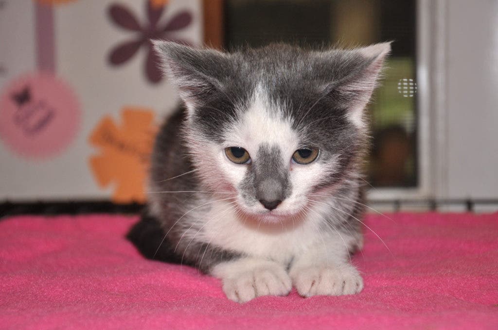 PATCH is a very sweet, outgoing, and adventurous 9 week old gray and white kitten. She came to Heartland with her four siblings who were all found as strays. After a long day of exploring, Patch loves to cuddle up with people.