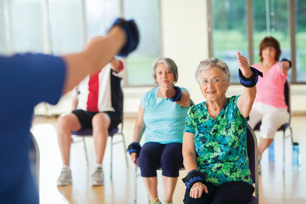 Photo Caption: Exercise classes for older adults help maintain strength and balance, reducing the risk of dangerous falls.
