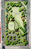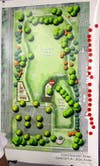 Concept A .44 acres for small dogs, 1.37 acres for large dogs, a combined entrances for all dogs, a shared shelter, a walking path outside the fenced dog areas, space for a dog washing station and room for a children's playground.