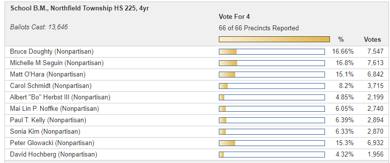 For the Glenbrook High School District 225 Board of Education, 10 candidates were vying for four seats. Challenger Michelle Seguin was the top vote-getter (16.8 percent, 7,613 votes). Incumbent Bruce Doughty, current president of the board, was next (16.66 percent, 7,547 votes). Incumbent Peter Glowacki (15.3 percent, 6,932 votes) and challenger Matt O'Hara (15.1 percent, 6,842 votes) also won seats.