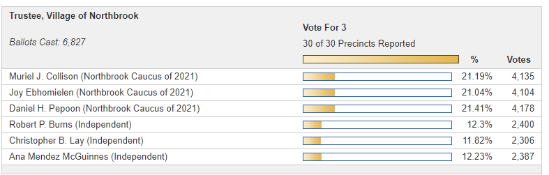 Current Trustee Kathryn L. Ciesla opted to run for Village President, leaving her seat up for grabs, with Sandra E. Frum set to retire. An attorney, Ciesla was a trustee for three terms since 2009 and has also been on a number of local boards. Her campaign was backed by the Northbrook Caucus of 2021.