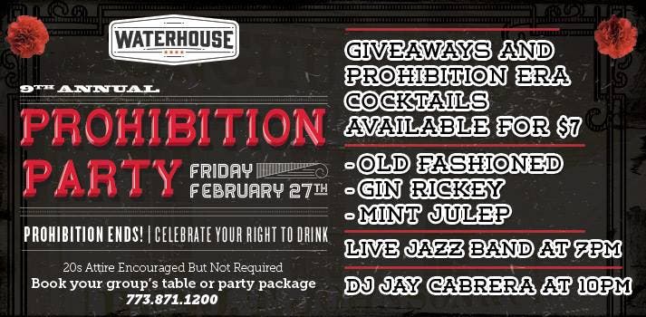 Celebrate your right to drink this Friday at 7pm! Giveaways, Prohibition era cocktails and live Jazz music!!
