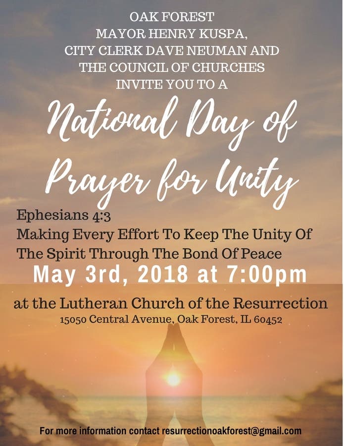 Oak Forest Mayor Henry Kuspa, City Clerk Dave Neuman, and the Oak Forest Council of Churches invite you to the National Day of Prayer for Unity on May 3rd, 2018 at 7:00pm at the Lutheran Church of the Resurrection (15050 Central Ave, Oak Forest, IL 60452).