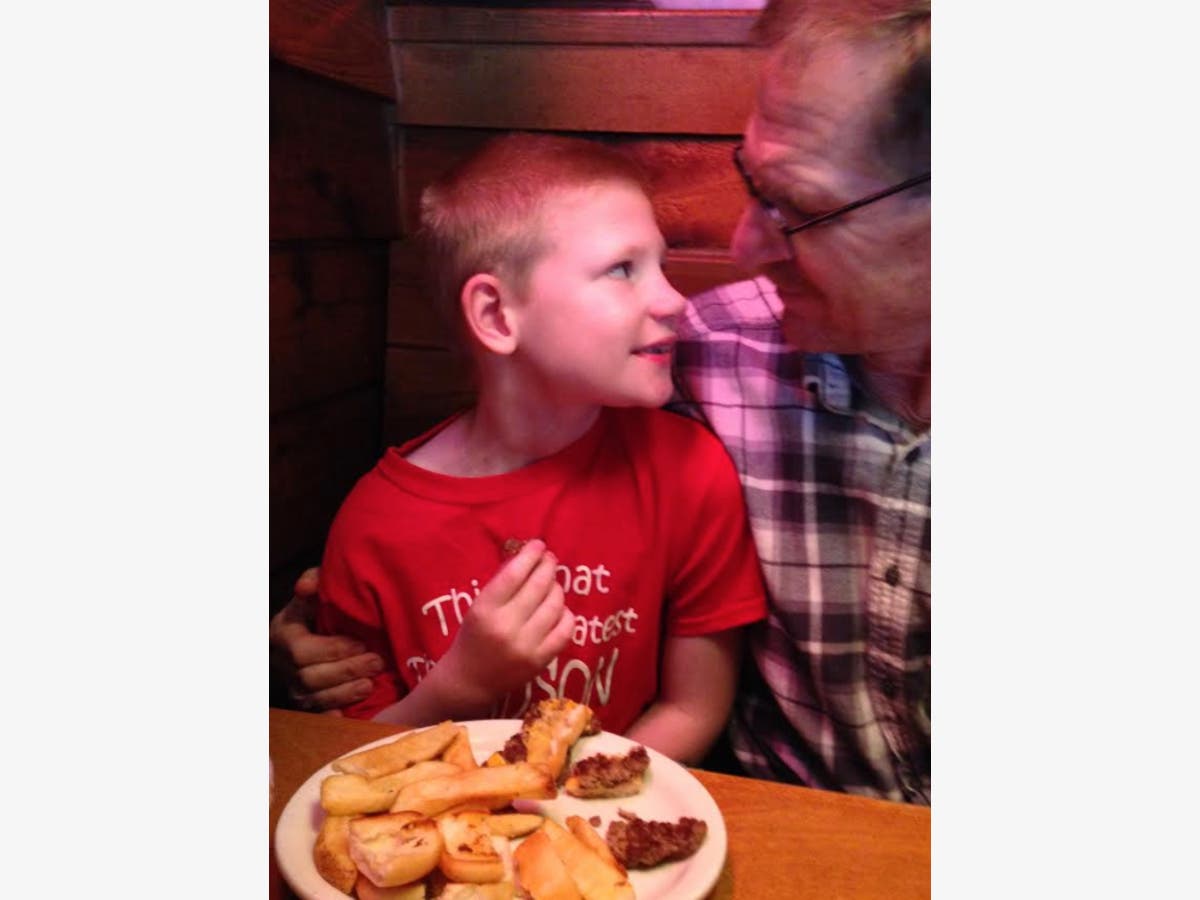 This photo shows true love from a child to his devoted Papa. Look at his eyes. This is my Grandson Shawn Roorda sharing a Father's Day lunch at Texas Roadhouse in Countryside Illinois with his Papa, my husband, David Faulkner Sr.