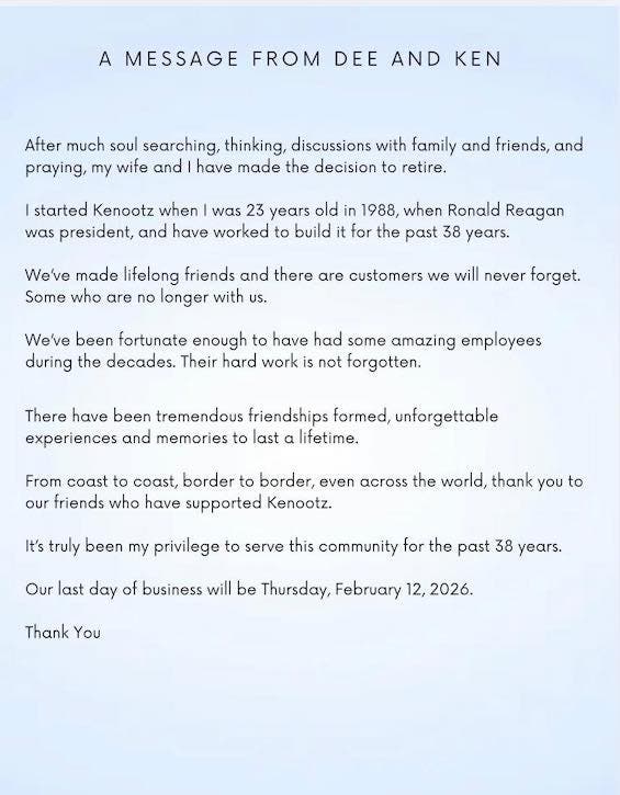 "I started Kenootz when I was just 23 years old in 1988 when Ronald Reagan was president," Keeler wrote, and have worked to build it the past 38 years.