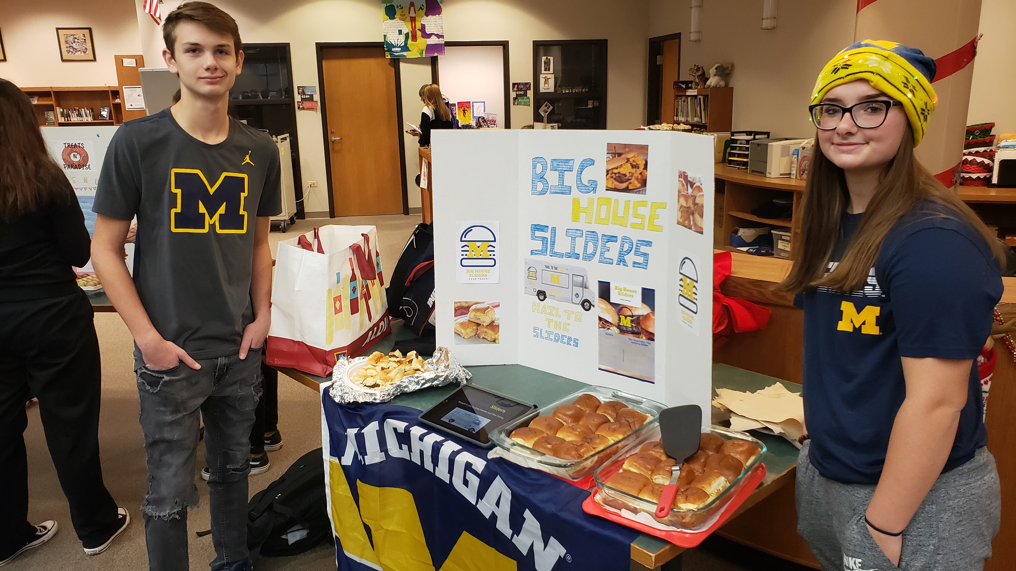 While it would be impossible for students to purchase their own food trucks (and fit them into the Oak Forest High School library), the concept remains the same. Many students brought food samples for judges to try out. Some students even sported attire to represent their business. For example, Riley Ensing and Cody Koerber, who created Big House Slides, developed a Michigan State themed food truck to sell various sliders near tailgates at the college stadium. They were decked out in Michigan State wear and believe their food truck concept could be spread throughout various colleges and universities.