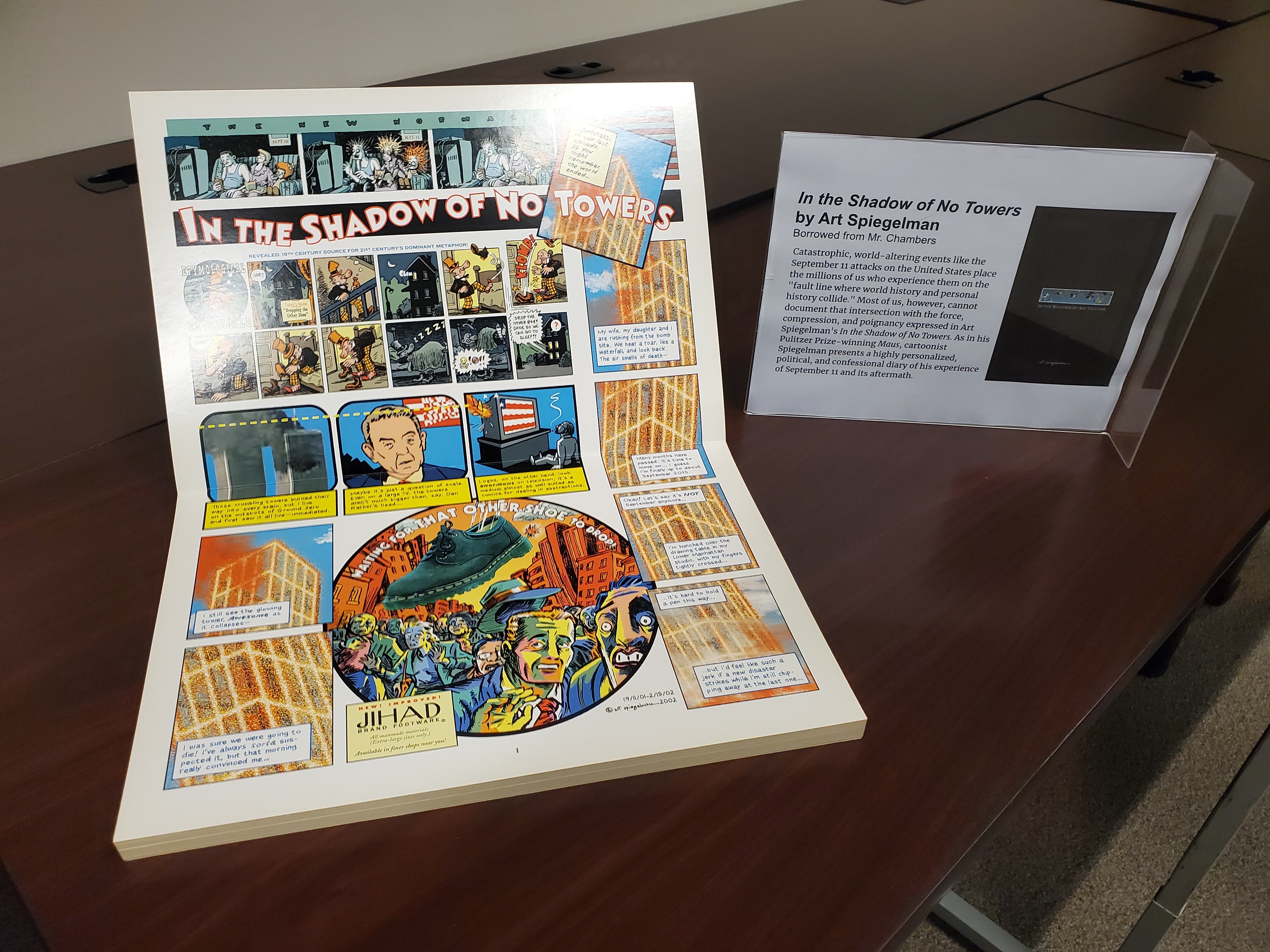 Mr. Dan Chambers, an Art Teacher at Oak Forest High School, also caught wind of the exhibit. He offered his copy of the graphic novel In the Shadow of No Towers by Art Spiegelman for viewers to flip through.