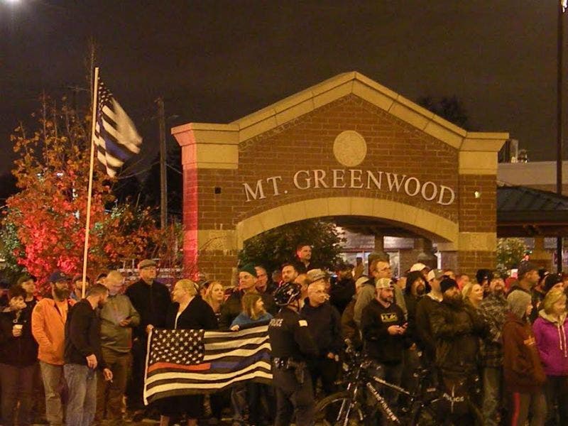 The Blue Lives Matter protest was scheduled in anticipation of a scheduled protest staged by black activists from SURJ (Standing Up for Racial Justice) accompanied by the Rev. Michael Pfleger in the Mt. Greenwood neighborhood where many of the city’s police officers, firefighters and city workers reside.