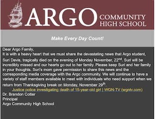 JUSTICE, IL — Tragedy has struck the Argo Community High School for a second time in six months, with the shooting death of a 15-year-old sophomore on Monday.