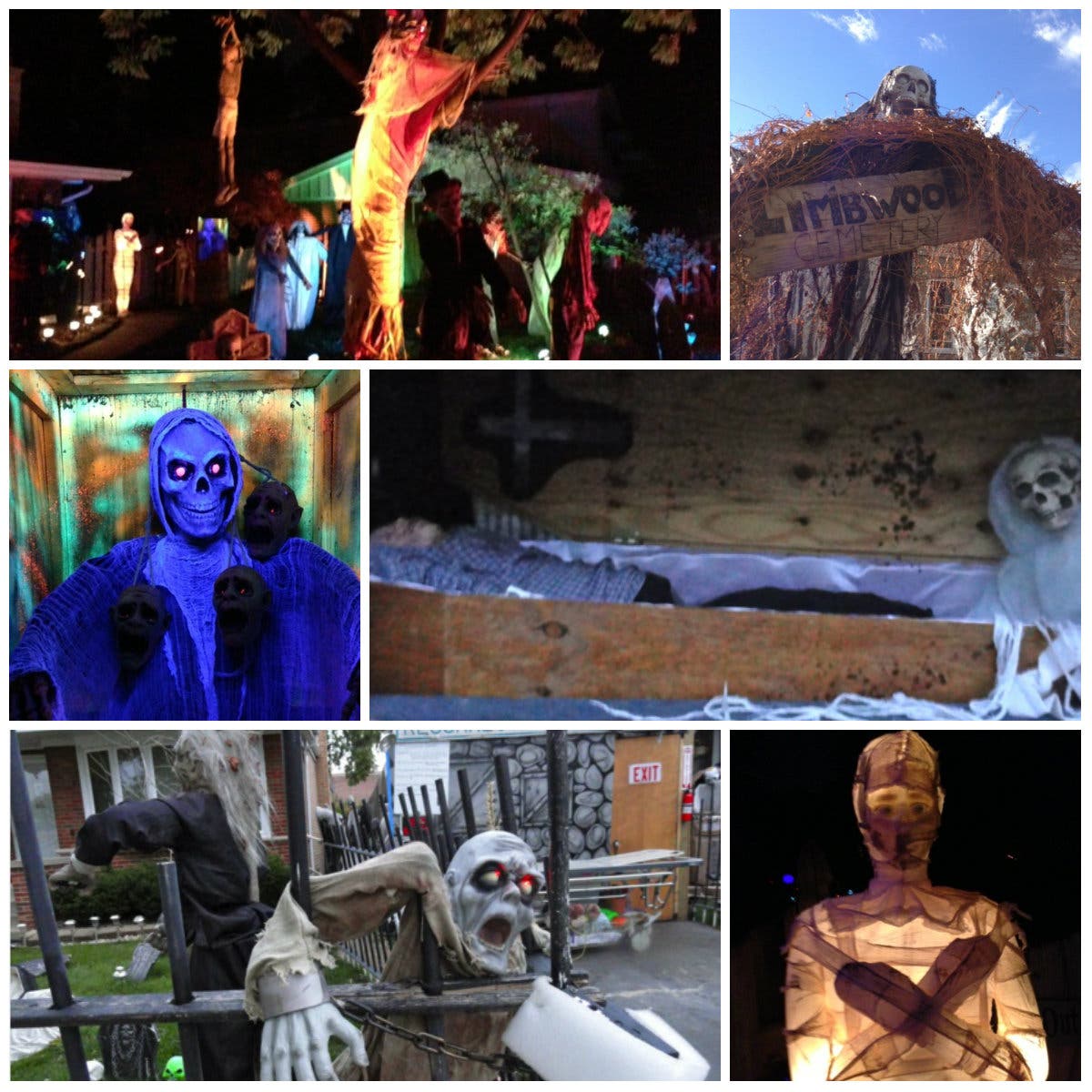 - LIMBWOOD CEMETERY, 9112 LYNWOOD AVE., OAK LAWN - This work- in-progress started out with a few dollar store tombstones and couple of crows. Now the yard haunt has tripled in size and includes a homemade eight-foot-tall grim reaper, music and fog. Keeps getting bigger and better every year. We saw a ghoul proudly #FlyingTheW. Extra points for being Cubs fans.