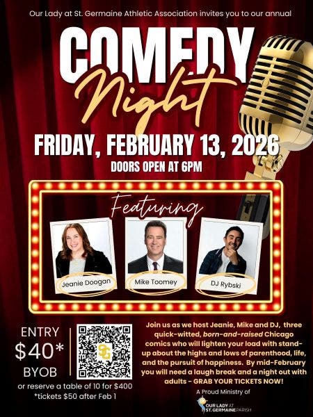 OAK LAWN, IL — Three quick-witted, born-and-bred Chicago comics will be generating laughter at Our Lady at St. Germaine’s Comedy Night this Friday, Feb. 13. Doors open at 6 p.m. with the show starting at 7 p.m., 9711 S. Kolin Ave., Oak Lawn.