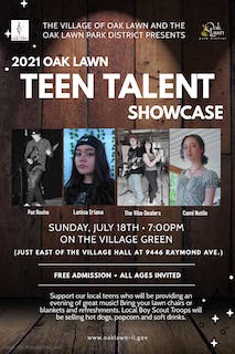The teen showcase is part of the free Sunday Concert Series, sponsored by the village and Oak Lawn Park District. Bring your chairs, blankets, snacks and beverages and enjoy an evening of music in the fresh air. The restrooms in the village hall lobby will be open during the concert.
