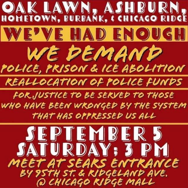CHICAGO RIDGE, IL — A flier for a protest march that has been circulating on neighborhood Facebook groups is planned for Saturday, Sept. 5. The group will be gathering at 3 p.m. near the Sears entrance at Chicago Ridge Mall, 95th Street and Ridgeland Avenue. The march steps off at 3:30 p.m.