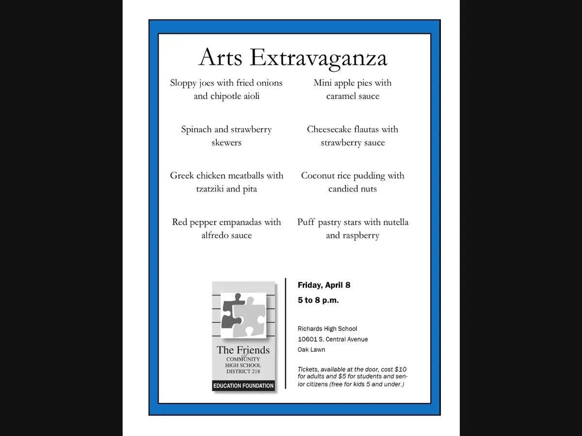 The CHSD 218 Education Foundation’s 12th annual Arts Extravaganza kicks off from 5 to 8 p.m. Friday, April 8, at Richards High School, 1601 Central Ave., Oak Lawn. The evening’s events include live dance, theatrical and musical performances; displays of find and industrial art; and a sampling of scrumptious culinary creations.