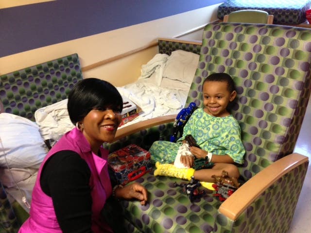Jessie Tendayi visits with Jayson Harris at Advocate Children’s Hospital in Oak Lawn, IL.