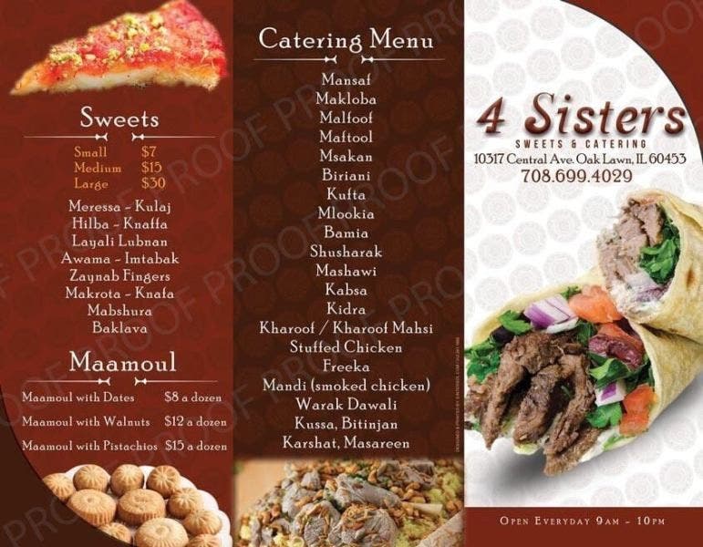 4 Sisters Sweets and Catering is located in the strip mall at 10317 S. Central Ave., Oak Lawn (next to Dunkin’ Donuts). The restaurant is open daily from 9 a.m. to 10 p.m.