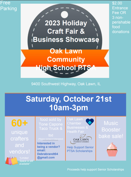 OAK LAWN, IL — Get a jump on your holiday shopping this Saturday, Oct. 21. The PTSA Holiday Craft Fair and Business Showcase run from 10 a.m. to 3 p.m. at Oak Lawn Community High School, 9400 Southwest Highway.