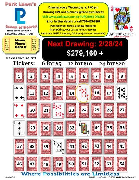 Park Lawn Queen of Hearts Raffle Feb. 28 drawing.