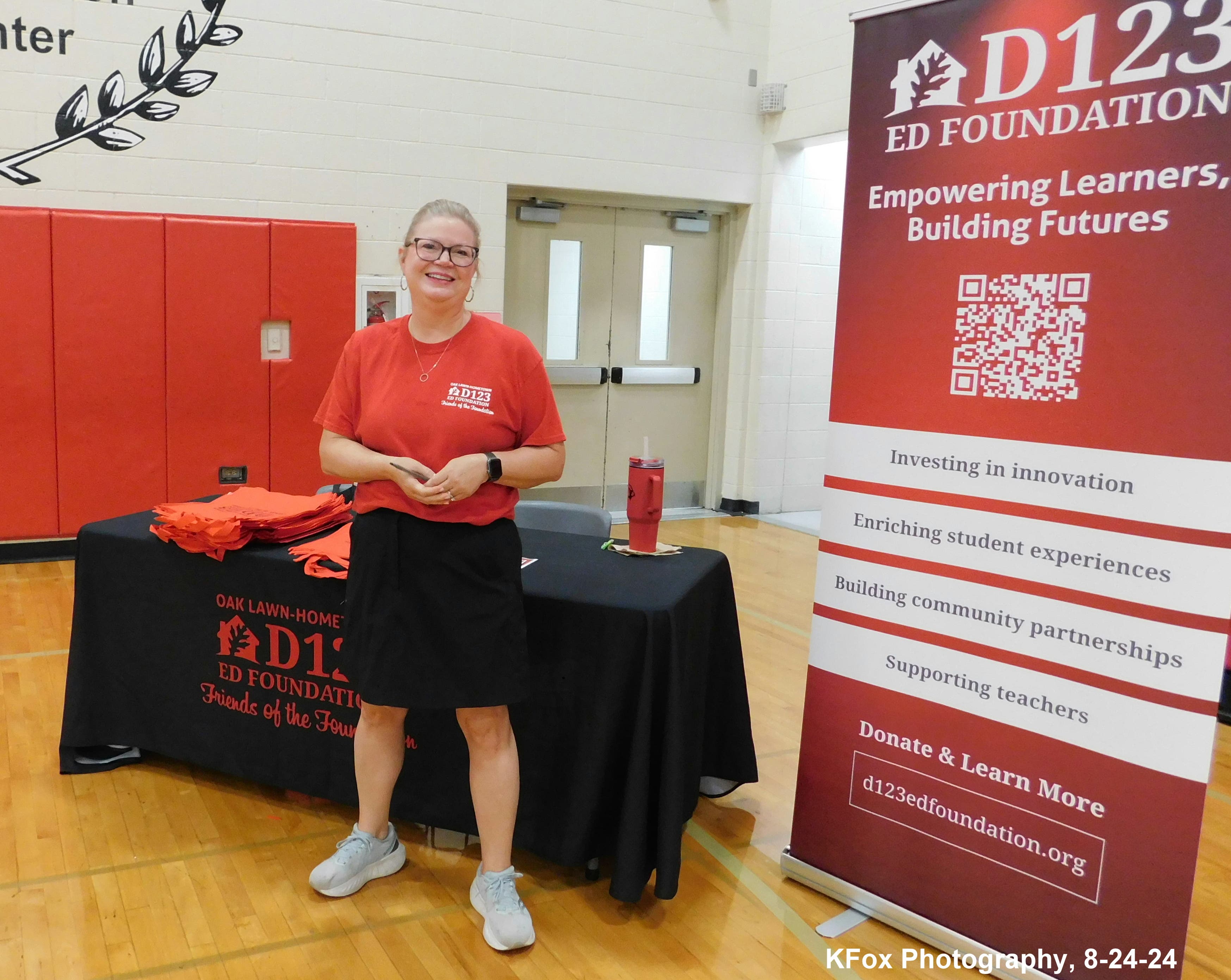 All Oak Lawn-Hometown District 123 schools, including Covington, Hannum, Hometown, Kolmar, Sward, and Oak Lawn-Hometown Middle School PTSA, set up tables to distribute school swag, sell t-shirts, and provide information. The District 123 Education Foundation also had a presence, sharing details about their programs and initiatives.