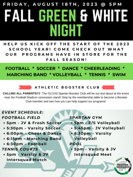 At 6:30 p.m. the football team will suit up and take the field. The OLCHS Athletic Boosters will be in attendance for membership sign up as well.