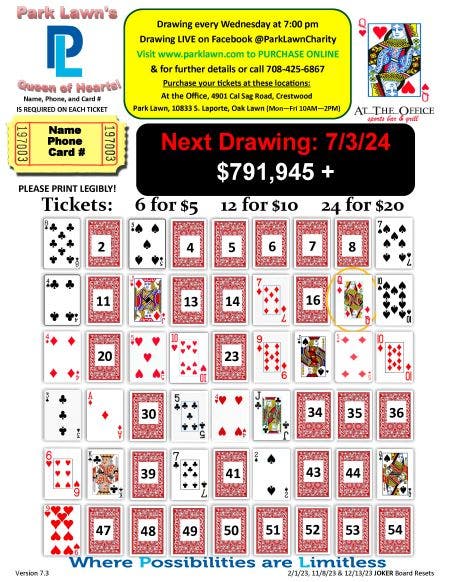 Park Lawn Queen of Hearts board for the July 3, 2024 drawing.