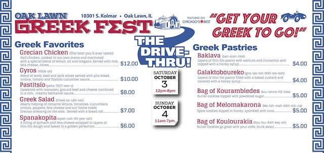 OAK LAWN, IL — Opa! St. Nicholas Greek Orthodox Church in Oak Lawn, 10301 S. Kolmar Ave., will be holding a drive-thru Greek Fest this weekend. Residents can pick up some delicious Greek cuisine from noon to 8 p.m. Saturday, Oct. 3, and from 11 a.m. to 7 p.m. Sunday, Oct. 4.