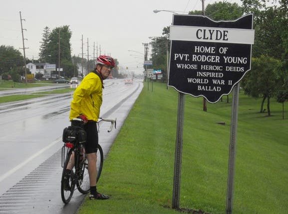 Caption: Marist teacher Owen Glennon outside of Clyde, OH, hometown of Pvt. Rodger Young.