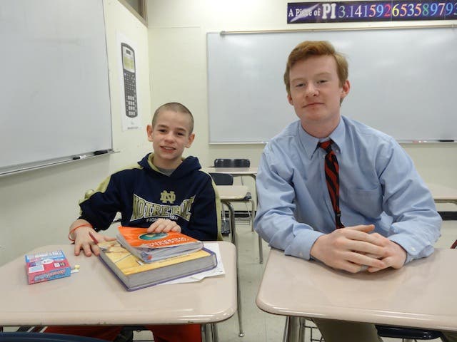 Marist senior Patrick Keffer (right, of Evergreen Park) sits with a grade school student during last year’s tutoring program. The pair reviewed homework each week when they met at Marist.